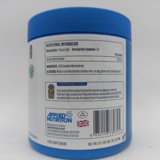 این محصول از برند Applied Nutrition حاوی 250 گرم است و هر سروینگ از آن، شامل 5 گرم می باشد. یک وعدهی 5 گرمی از این کراتین را به آب اضافه کرده، به خوبی تکان دهید و مصرف کنید. می توانید این محصول را 1-2 بار در روز و ترجیحاً قبل از ورزش استفاده کنید. پس از 8 هفته استفاده مداوم، 1 هفته استراحت کنید و چرخه را دوباره شروع کنید.
