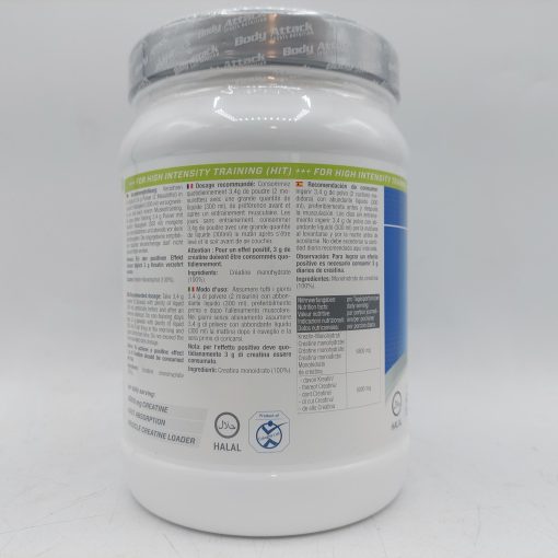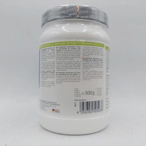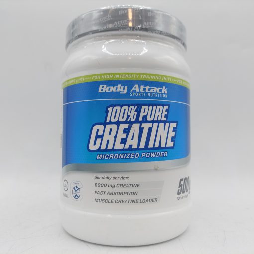 کراتین 100 درصد خالص بادی اتک Body Attack 100 Pure Creatine یک پودر کراتین مونوهیدرات میکرو بدون مواد اضافی است که به خوبی در آب یا آبمیوه حل می شود. این محصول دارای خاصیت افزایش عملکرد بدنی در تمرینات سرعتی و قدرتی به عنوان بخشی از یک تمرین مختصر و شدید است.
